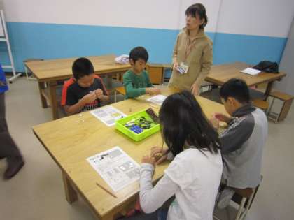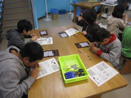 生き方探究館の地下室では、実際にモノづくりを体験できます。4年生が挑戦したのは、電子オルゴールづくりでした。細かな部品を身近な材料と組み合わせて、一人ひとりが自分のオルゴールを作りました。なかなか、細かくてうまく作れないのですが、なんとか音楽が流れると、うれしい顔がたくさん見られました。