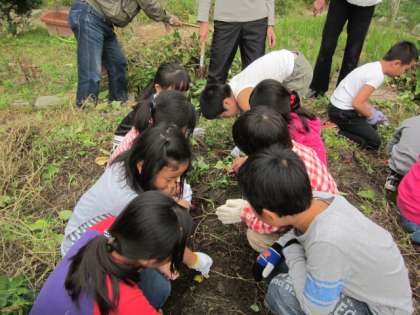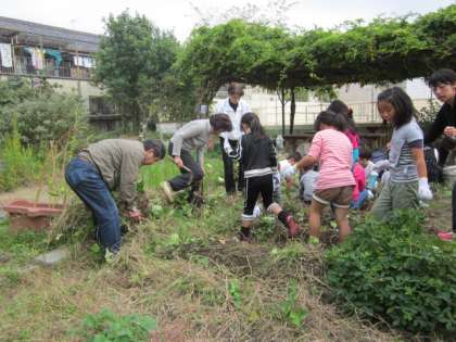 お話を聞いたあと、畝の前に座り、いよいよ土を掘ります。