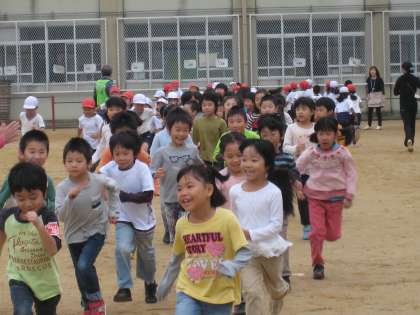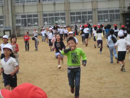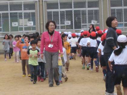 最初は準備運動にコースを歩いて,音楽が変わったら走り始めます。約4分間のランニングです。1年生は初めてなので,最初にスピードをあげすぎて,後半にバテてしまった子もいました。