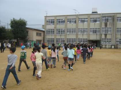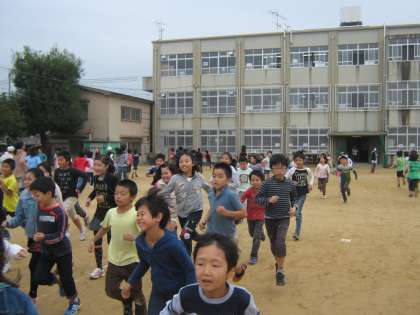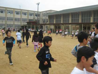 朝まで雨が降っていましたが,運動場はまあまあのコンディションでした。いよいよ今日から朝ランニングが始まりました。最初は歩いて,体を慣らします。そして音楽の変化に合わせて,さあランニング開始です。
