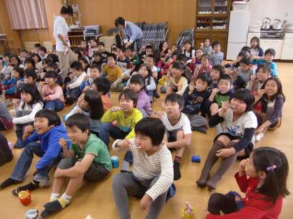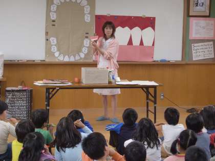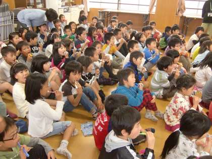 むし歯予防の話の後だけに,みんな真剣に歯磨きの練習をしています。