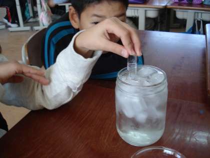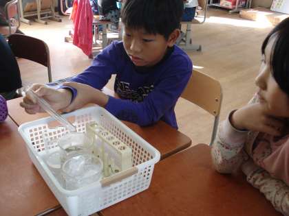 理科で,「空気をあたためたり冷やしたりすると体積はどうなるか」について,実験をして調べました。