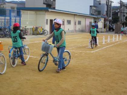 次に高学年は、国際ルームで筆記テストです。事前に配布した冊子を勉強したらわかるというものでした。その間に、低学年は、お待ちかね、自転車での走行練習を行いました。