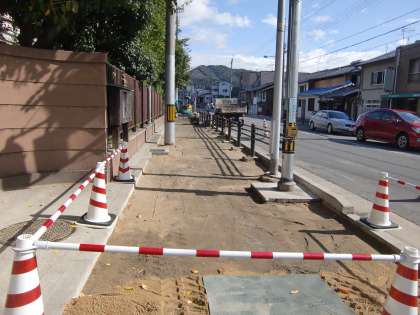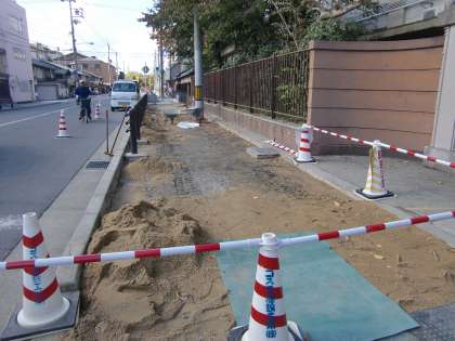 PTA会員の皆さんにはメール配信でお知らせ済みですが,正門を出た所の歩道の工事が始まっています。以前,掘り返したところにはアスファルトで応急的な措置が施されていましたが,今回,それをもとのようなインターロッキングにしようという工事です。14日まで続くようです。