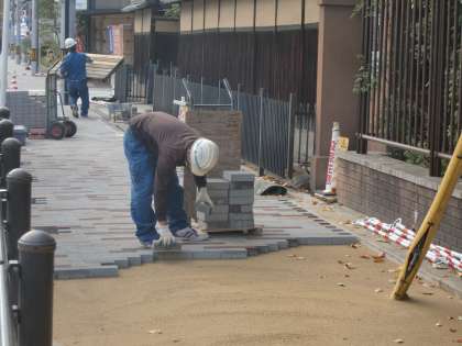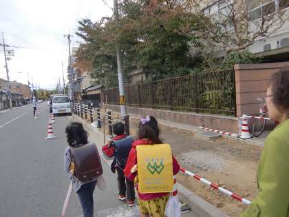 学校の前の歩道は工事が始まりましたので通れません。子どもたちの下校は一定区間車道を歩くことになりますが,コーンを置いてガードマンさんも立ってくださっています。