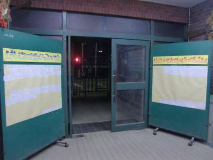 学校の中で見つけた『かっこいい人』を玄関のところに貼り出しました。『かっこいいしきん』を絵に描いた餅に終わらさず,子どもたちの学校生活の中に根付かせるための取組です。