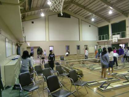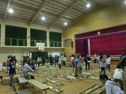 まずは,体育館の中で長椅子やパイプ椅子を並べる仕事に精を出すグループからです。会場準備がどれだけ大切な仕事であるかを知っている子は一所懸命進んで動いてくれています。