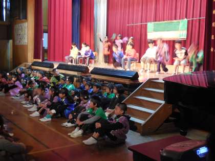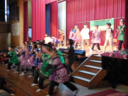 劇の最後は全員が表に出てきて声を出したり,運動会でも踊った「にんじゃりばんばん」を踊ったりしました。