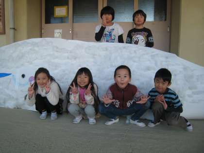 学習発表会の劇で登場した,みんなで作ったくじらぐもと一緒に記念写真を撮りました。