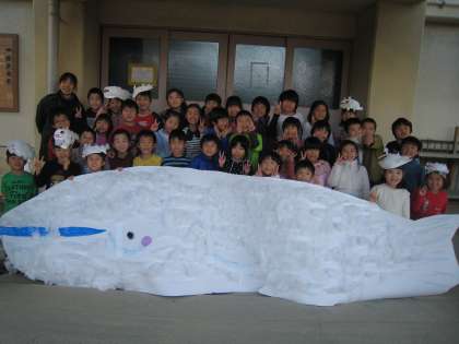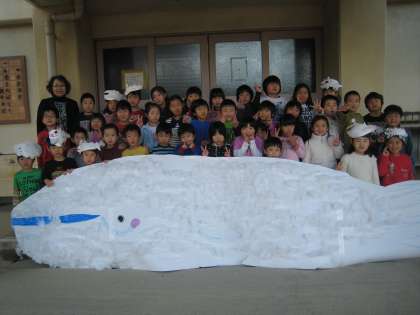 学習発表会で登場したくじらぐもと1年生全員で集合写真を撮りました。
