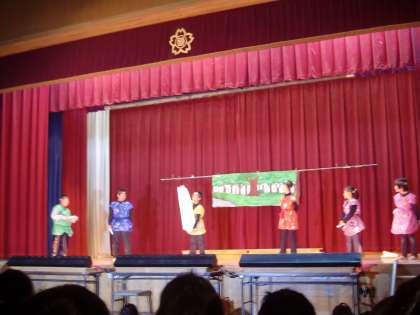 4年生の劇にも英語のせりふがたくさん出てきました。日常生活でよく使う単語やフレーズですからフロアの子どもたちにもちゃんと分かったんじゃないかなと思います。