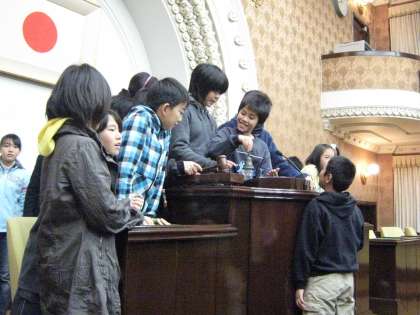 2,3時間目に京都市議会見学に行ってきました。まずは市議会についてガイダンスを受けた後,本会議場を見学しました。初めて入る本会議場の迫力に子どもたちは圧倒されているようでした。議長席に座ってみたり,議員さんの名札をさぞかし自分の名札に見立ててみたりと感慨深い様子でした。歴代議長の写真が掲示してあるのも子どもたちにとって印象深かったようでした。