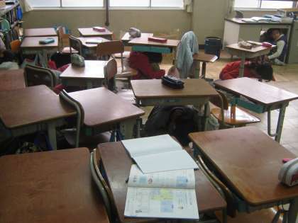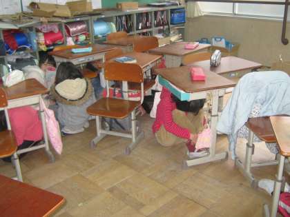 月に1回のペースで「シェイクアウト訓練」を行っています。1分間ですが,継続は力なりです。すぐに自分の身を守るために机の下にもぐり,危ない場所のそばにはいないようにする意識が育ってきました。