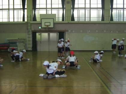 体育館の体育で,少し予定を変更して友達と一緒に楽しく体を使っての学習をしました。拍手をしてその数だけ人数が集まってグループを作ったり,柔軟体操をしたり,二人組で背中を付けて一緒に起き上がったり。立ち上がるのがすごく速い組となかなか起き上がれない組とがありました。二人の息の合わせ方にコツがあったようです。
