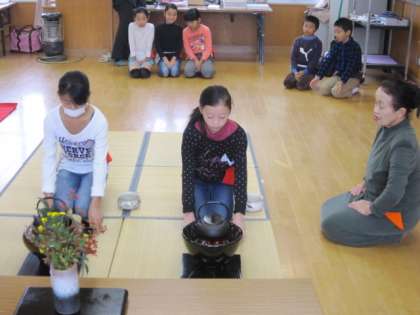 今日のお点前をしてくれた茶道部の子どもたちは、日頃の練習よりもずっと緊張していたことでしょう。お点前をいただく子どもたちでさえ、その空気を感じ取って、その空間を楽しんでいるようにさえ感じました。親子で、茶碗のまわし方を確かめあって、お茶の伝統を学んでいました。
