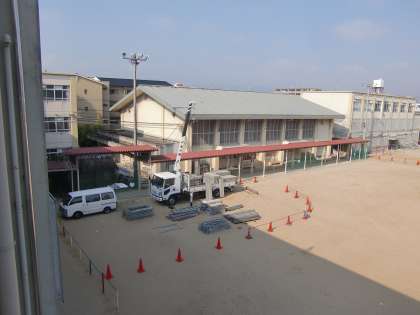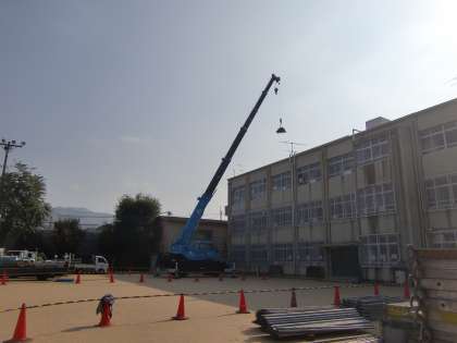 老朽化から給水管の工事をすることになりました。写真はその準備をしているところです。大きなクレーンで本館の屋上に工事資材を運んでいます。