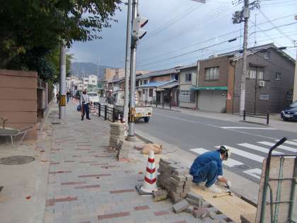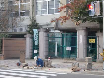 学校の前の歩道のインターロッキング工事が間もなく完成のようです。