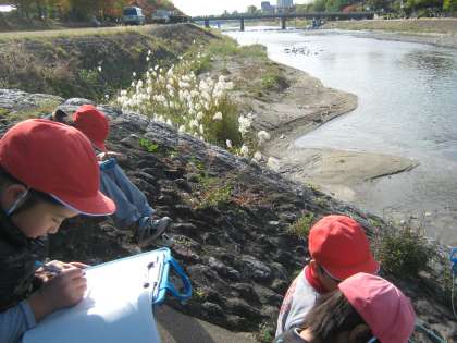 理科の学習で1・2組合同で鴨川に自然観察に行きました。空気もずい分冷たくなりました。木々の葉が色づき,秋が深まって来ています。
