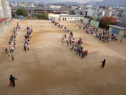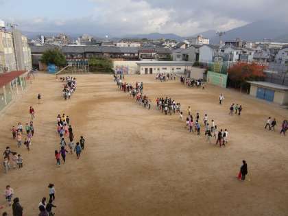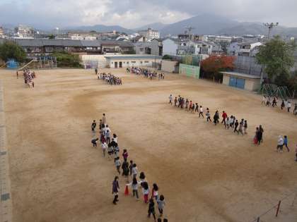 まずは体慣らしです。『あたりまえ体操』の曲に合わせて30秒歩きます。
