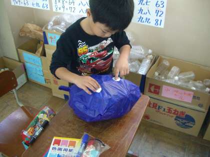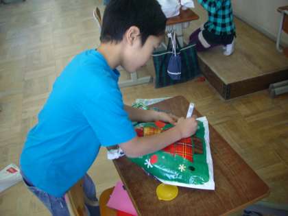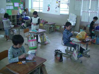 図工の時間に袋を使って作品を作る学習をしました。子どもたちは,材料や道具をうまく使いながら,思い思いの「ふくろちゃん」を作っていました。材料の準備,ありがとうございました。