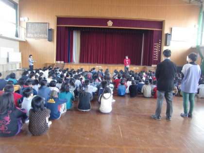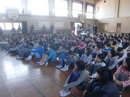 写真は体育館に避難後,話を聞く子どもたちです。真剣な表情が印象的です。