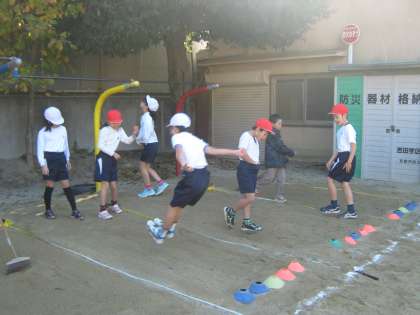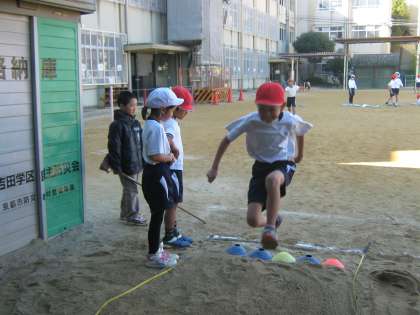 今日で幅跳びの活動が最後です。自己ベストを目指そうとがんばりました。踏み切った後に上に向かって跳ぶ意識をもつように,踏み切りの位置の先にミニコーンを置きました。初めての学習の時から比べると,とても距離が延びました。