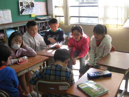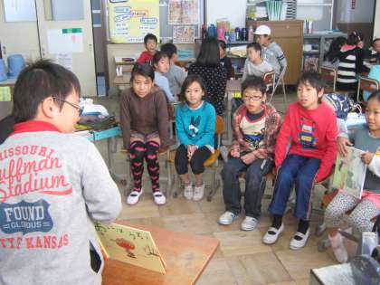 たてわり活動の「にこにこタイム」がありました。外での体育的なグループと,教室での読み聞かせをするグループに大きく分かれて活動しました。下の写真は,読み聞かせをしたグループの様子です。今日は,2年生と4年生が本を用意してきてくれました。3年生も他の学年もしっかり集中して聞いていました。