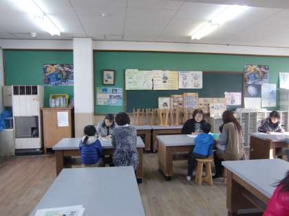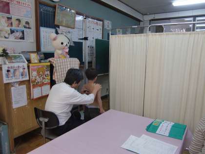 健診会場を5年生に手をひかれて回った園児たちは,保護者控室で久しぶり(?)に保護者と対面します。