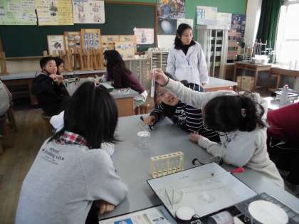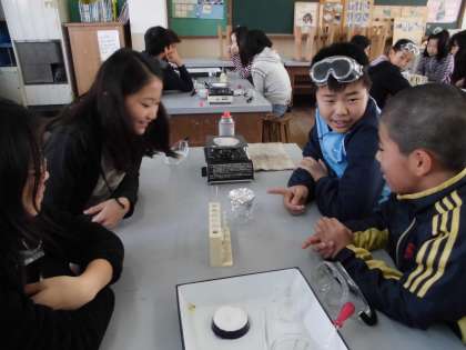 アルミニウム箔の上に塩酸を数滴落とすと・・・塩酸の中にアルミニウムを入れると・・・班で協力しながら実験ができました。