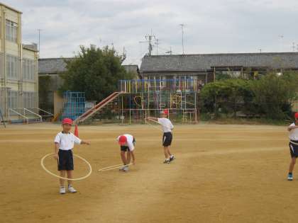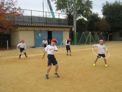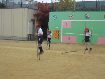 今日から,1組と2組と種目を交換して学習します。2組は,フレアースポーツ。フラフープは自信がある子が多かったですが,竹馬は,「難しい!」という声も。でも,友達のできている姿を見て,それを真似たら「今日はじめて出来た」という子もいました。