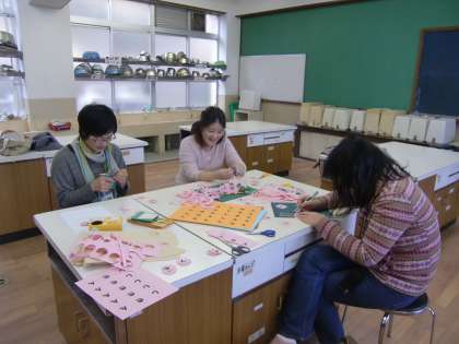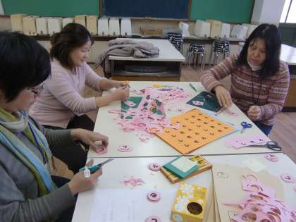 英語ボランティアの皆さんが今日も教材を作ってくださっています。色画用紙に印刷した丸いカードを切り抜く作業です。丸く切り抜くのはとてもとても時間がかかります。