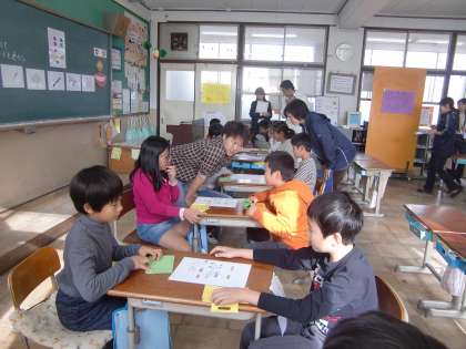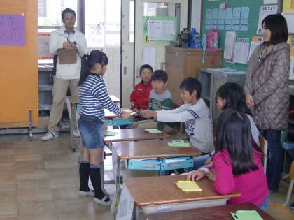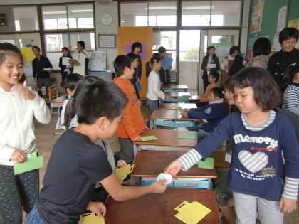 3の1の授業です。『おつかいできるかな?』という英語活動です。英語ボランティアの皆さんの支えのおかげで,子どもたちはのびのびと英会話を楽しみました。