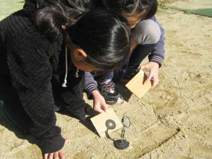 虫めがねを使って太陽の光を集めて,明るく熱くなるのかを確かめる実験をしました。虫めがねを段ボールに近づけたり遠ざけたりすると,光の輪が小さく点になり,煙が出るほどに熱くなることを確かめられました。