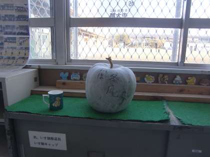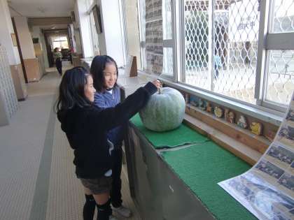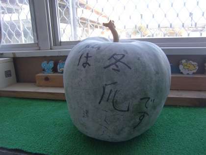地域の方が大きな冬瓜を持って来てくださいました。「ちょっと珍しい大きさなのでぜひ子どもたちに見せてやってください」ということでした。