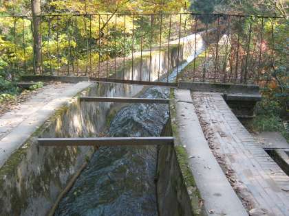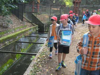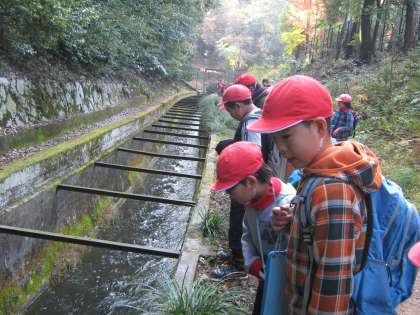 疏水分線に沿って水路閣を目指して歩いているところです。道幅が狭く,右は疏水,左はがけ。慎重に歩いてねと厳重注意をしておいたのでみんな上手に歩きました。