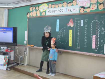 1年生は、「はしのうえのおおかみ」というお話をもとに道徳の学習をしました。お面をつけて、担任とやりとりする中で、おおかみの気持ちの変化を考えました。