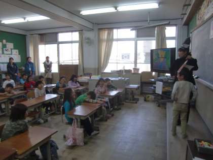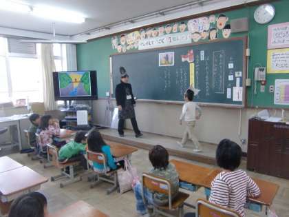 1の2の参観授業の様子です。『はしのうえのおおかみ』の話をより分かりやすくするためにオオカミやクマの面をつけて演じています。自分の考えや思いが素直に出せるということはとても素晴らしいことです。