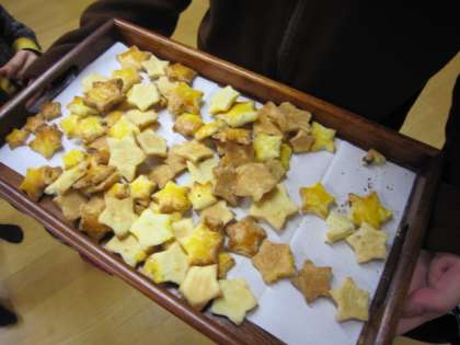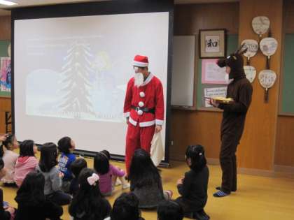 最後は、サンタさんとトナカイが登場して、チョコレートとクッキーのプレゼントをくださいました。記念写真をみんなで写して、スイスの二人をはじめ、同志社大学のみなさんに「ダンケ」とお礼を言いました。
