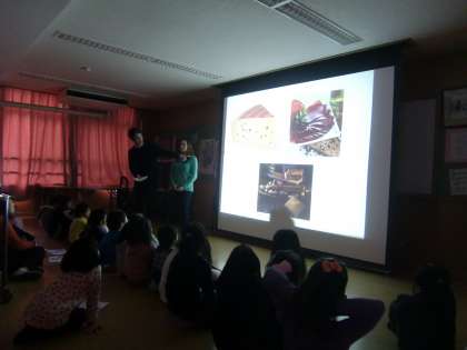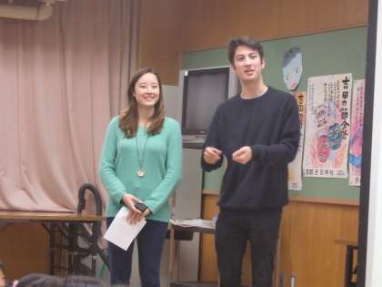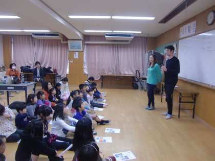 お待ちかねの『世界の和輪話』。スイスからの同志社大学に留学中の二人が四錦の子どもたちにハイジの国スイスのことをいろいろ教えてくれました。