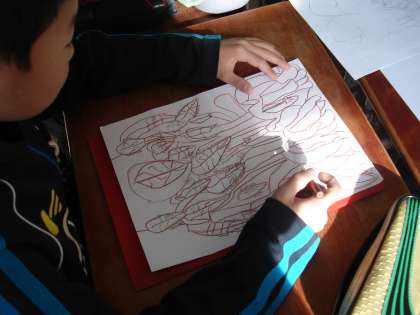 カーボン紙で板に写し,次はいよいよ彫刻刀の出番です。