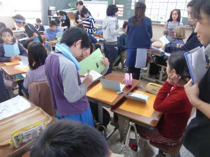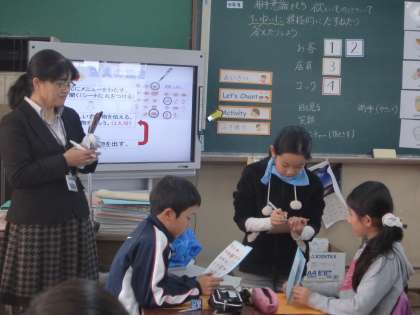 事前授業はもちろん外国語活動です。コミュニケーション力の育成を目指しています。