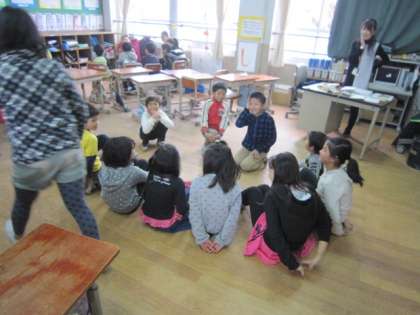 今日は久しぶりの雨が降りました。にこにこタイムは、運動場で半分のグループが遊ぶ予定でしたが、今日は室内遊びに変更です。ハンカチ落としやじゃんけん大会などそれぞれのグループが工夫して遊びました。