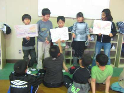 3年生は,絵本“The Very Hungry Caterpillar"から,いろいろな食べ物を食べたチョウの絵を見せながら,クイズを出してくれました。