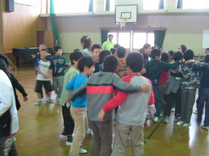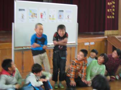 4年生は,「お天気キャスターになろう」から,お天気の仲間探しゲームを発表しました。同じお天気のカードを持っている人を見つけてうれしさのあまり「肩を組んで」いる姿があちこちに見られました。