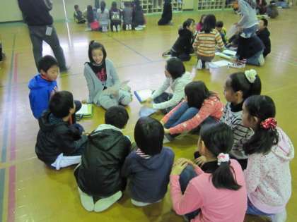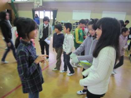 5・6年生のにこにこイングリッシュもゲームがいっぱいありました。言葉を英語で話しながら、ゲームを通して5年生と6年生が確かめ合っている姿がたくさん見られました。6年生は、自分の夢を5年生に伝えることに挑戦していました。自分の持っている英語の力で精一杯に伝えていました。