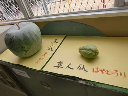 一つは隼人瓜(はやとうり),もう一つは首長南瓜(くびながかぼちゃ)です。ちょっと珍しい野菜ですね。地域の方が届けてくださいました。