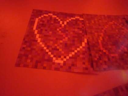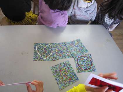 モザイクになった紙を覗き込むといろいろな絵が浮かび上がりました。ハートは白く縁どってあるので、よく分かるのですが、赤いセロハンを通すとひびが入っていました。赤い色を通す色ととさない色をうまく組み合わせて作ってありました。