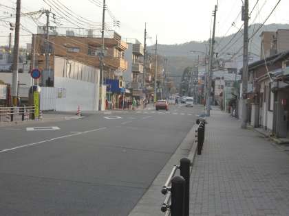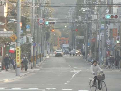 ただ,四錦の正門を出て東を眺めても,あるいは横断歩道を向かい側に渡って東を眺めても,吉田神社の鳥居は見えません。川端通から吉田神社までの東一条通はまっすぐな道というイメージがありますが,実は東山通の交差点で右の方に少し折れ曲がっていてまっすぐではありません。ですから学校の前からは鳥居は見えないわけです。