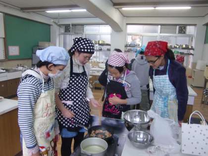 6年生が調理実習をしています。今回のテーマは『家族の喜ぶおかずを作ろう』。