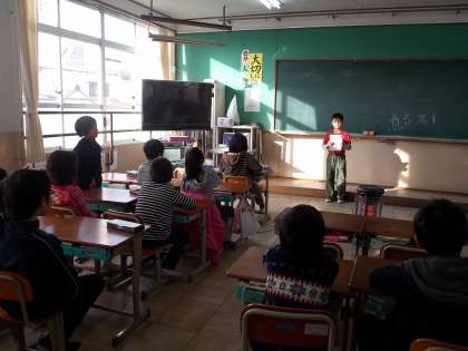 写真のスピーチは、国語の「すがたをかえる大豆」ででてきた言葉の意味の違いを発表しています。